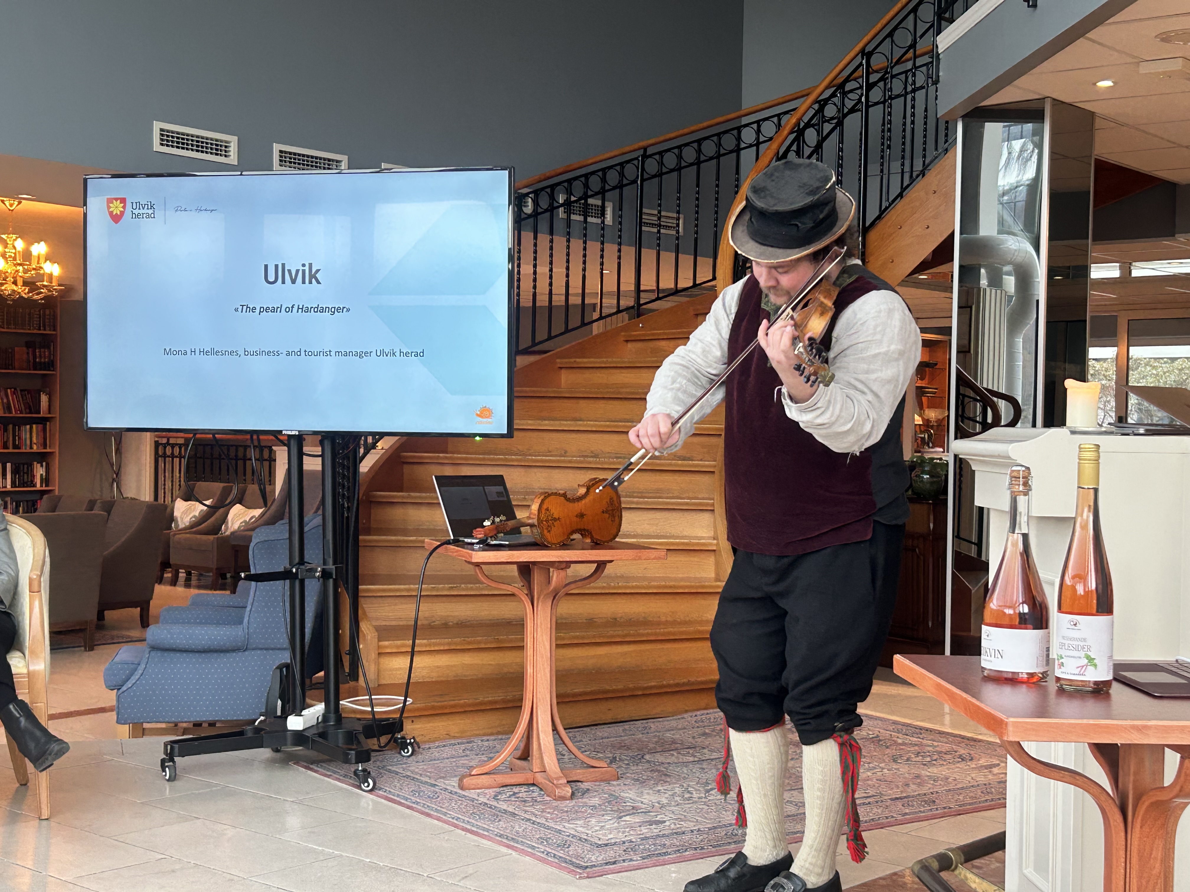 Etter spaserturen i sentrum fekk me omvising på Vøringfoss hotel, der var det bryllaup, så turoperatørane fekk sjå nokre av gjestene i bunad. Me fekk også omvising i Galleri Bergslien der Arild B Nielsen spelte på neverlur for oss, i tillegg til eit par fløyter, det var fint å høyre på og turoperatørane var begeistra! Etter dette måtte dei køyre tilbake til Bergen før me alle skulle vidare til Lofoten på NTW dagen etterpå. Turoperatørane fortalde at dei følte dei fekk sjå mykje av Hardanger på kort tid, så dei var særs nøgde