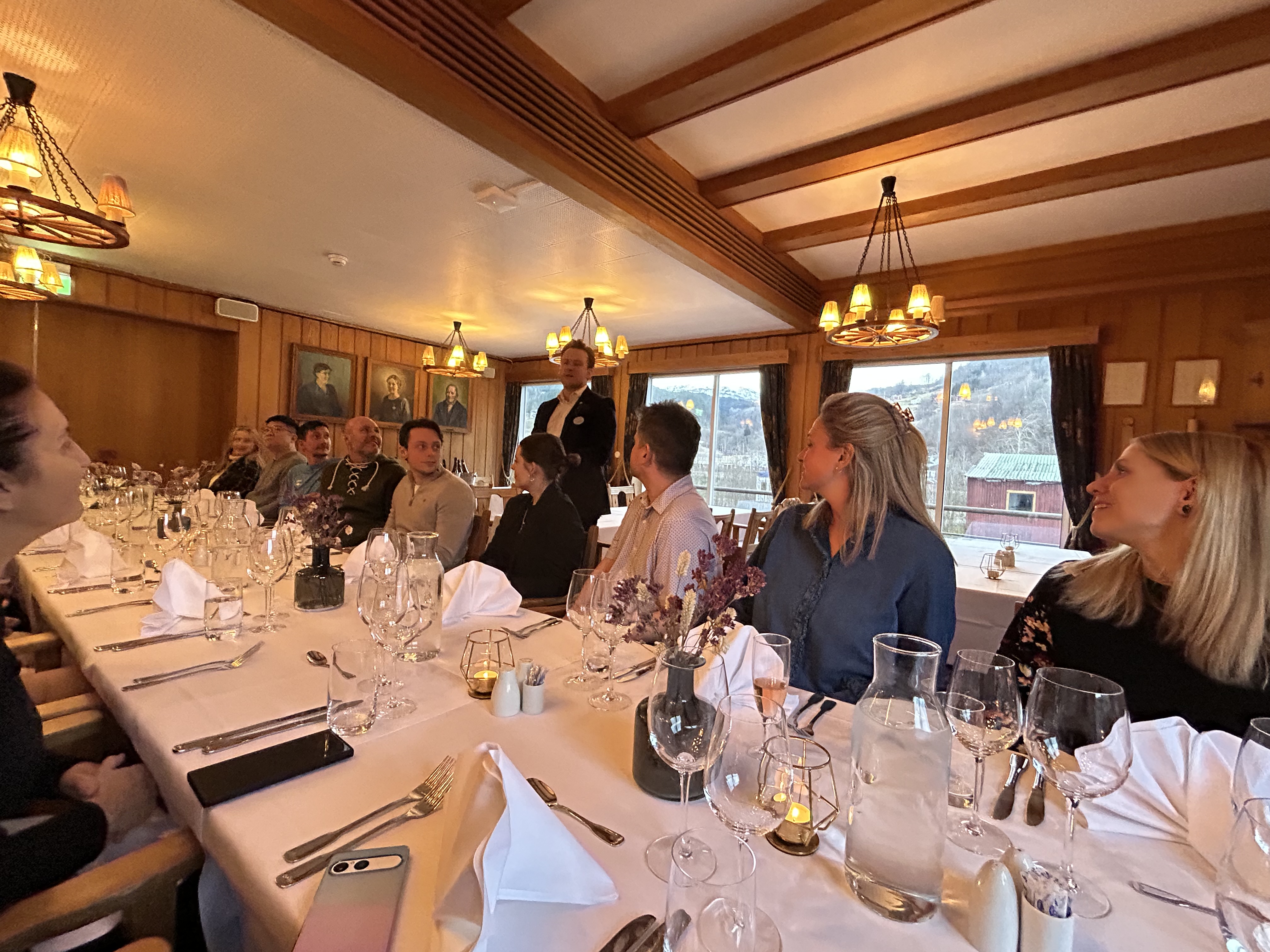 Kvelden vart avslutta med flott middag i den eldste og mest historiske delen av restauranten på Brakanes Hotel, maten var utsøkt og servicen var makalaus. Gjestene var særs nøgde med heile opplevinga. Det var også song og underhaldning under middagen.