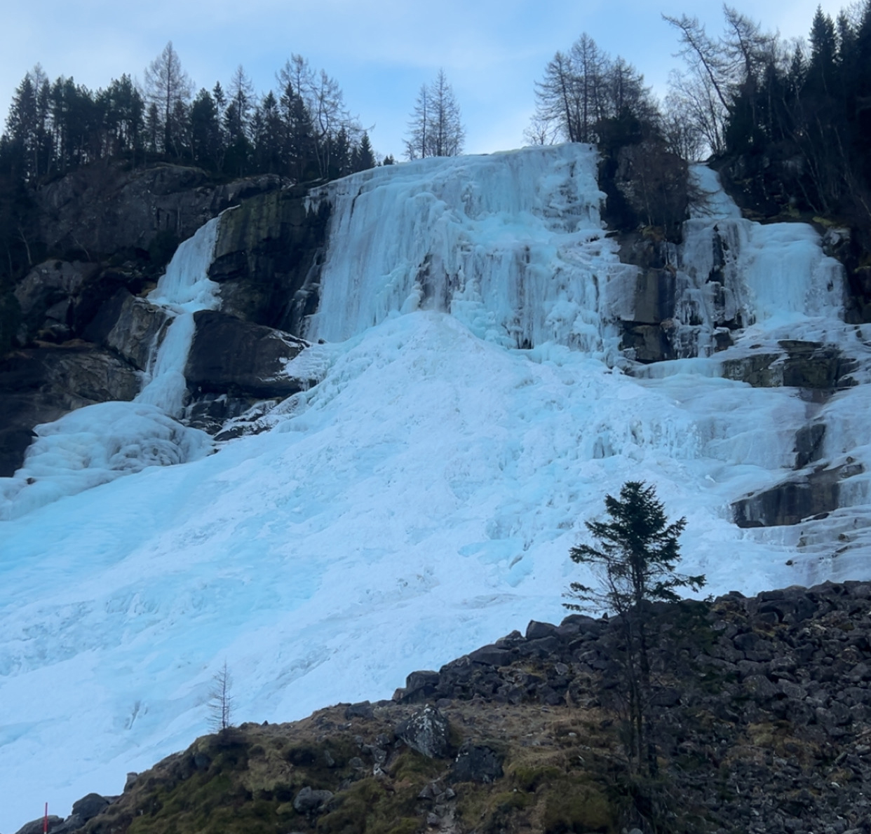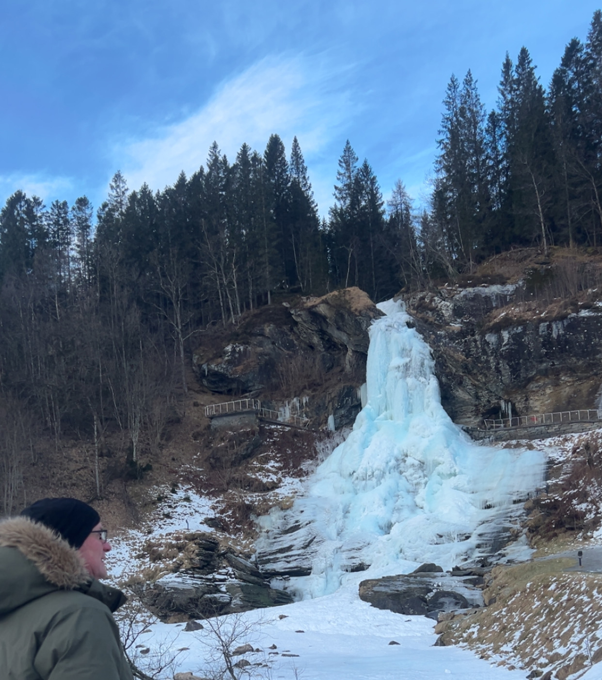 Etter frukost på torsdag køyrde me til Sunndal og fekk omvising i Olaløo av Inger Lise Bondhus, vidare til Rosendal og stoppa ved Furebergsfossen - som også var heilt frosen, noko dei fann eksotisk og artig.