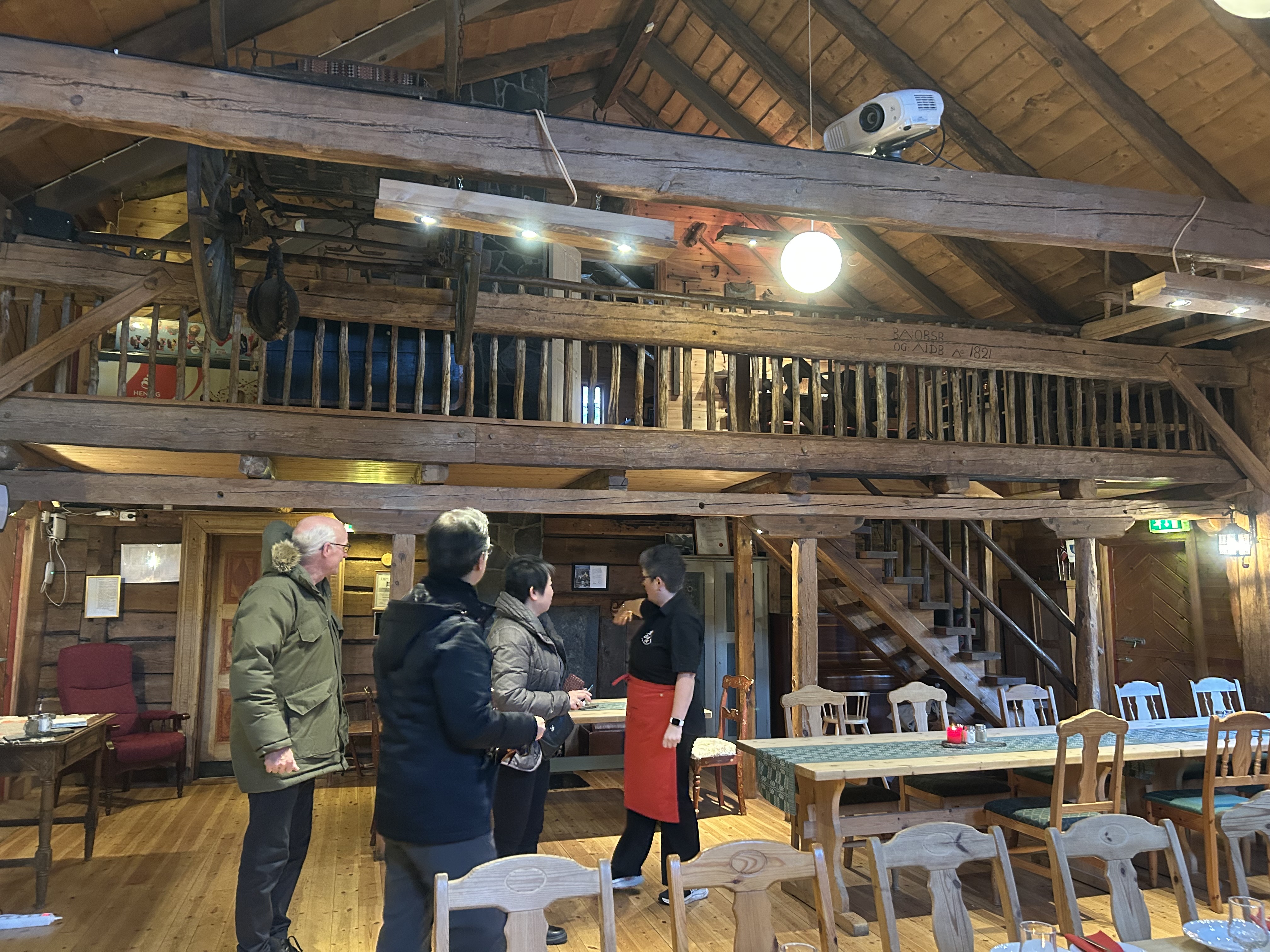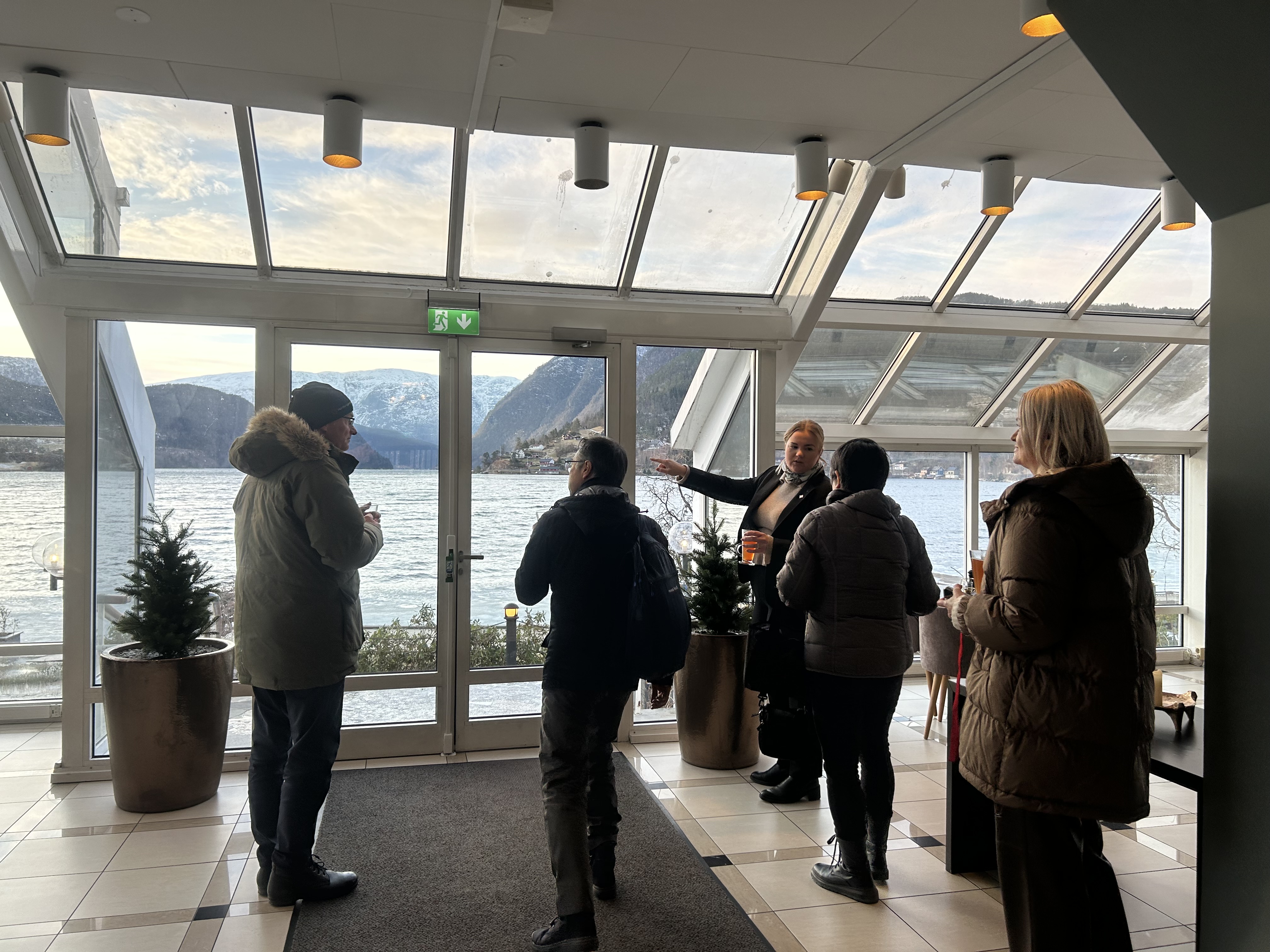 Onsdag morgon reiste me vidare til Ulvik der me fekk varm drikke til omvisinga av Brakanes hotel. Her vart dei imponert over utsikta!